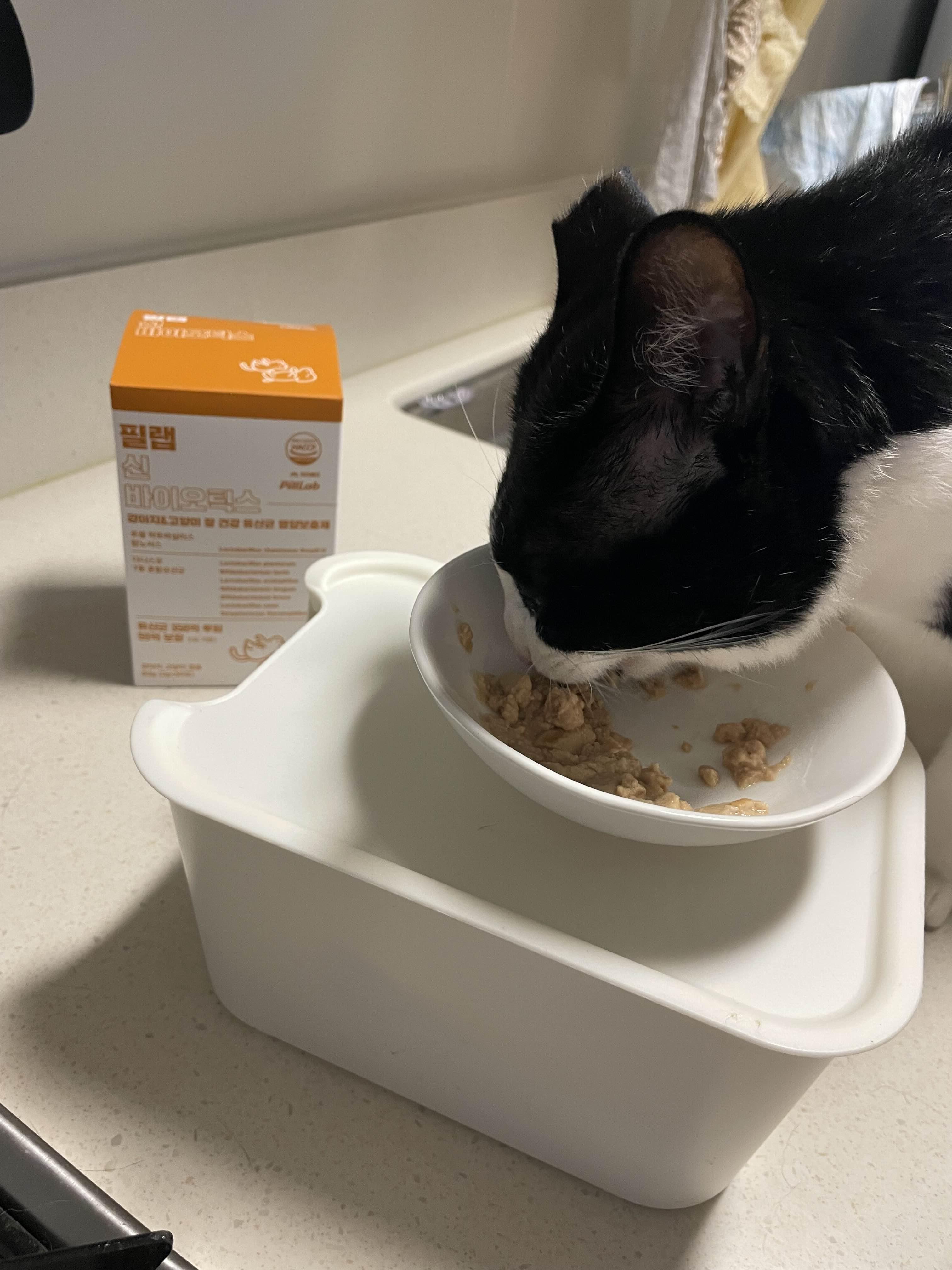 깨비는 유산균을 다 체험단으로만 접해봤는데 제일 처음으로 먹었던게 듀오펫이다. 작은 고체 제형이었는데 다른 고양이들은 모르겠지만 깨비는 쬐그만 알을 별로 안좋아한다. 건사료에 뿌려줬을때 퉤퉤 하거나 턱 밑 털에 대롱 대롱 붙어있는 경우가 많았다. 그래도 거의 막판에는 쬐끔 응가가 길어진걸 보면 효과는 있었을지도..! 근데 버리는 양이 더 많고 깨비가 밥 먹기 불편해해서 추가 구매는 안했다.